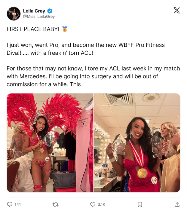 AEW’s Leila Grey sadly suffered a torn ACL during her December 6 match with Mercedes Moné, potentially sidelining her for a year. However, proving her toughness and not wanting to let her hard work in the gym go to waste, Grey would not only still compete at this past weekend’s WBFF Pro Fitness event but has revealed on X that she actually came first in the WBFF Pro Fitness Diva competition while wearing a knee brace.
