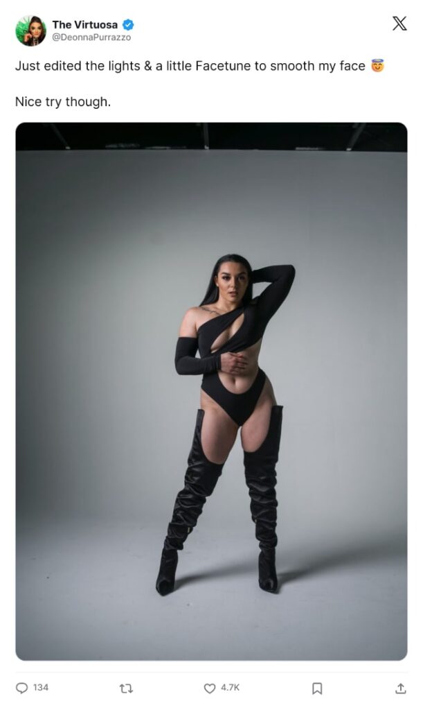 Still, she has no problem calling out these so-called fans on social media and has again done this on X, after one fan challenged her to “show us the real photo without the edits,” following her latest photo drop.