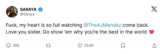 Despite @WWEShop spoiling AJ Lee’s return by confirming in a tweet that new merchandise was coming, the pop for her return at the conclusion of this week’s SmackDown was nevertheless epic. And now, among the dozens of wrestlers taking to social media to acknowledge this, her longtime rival Saraya’s has stood out, tweeting, “f*ck, my heart is so full.”