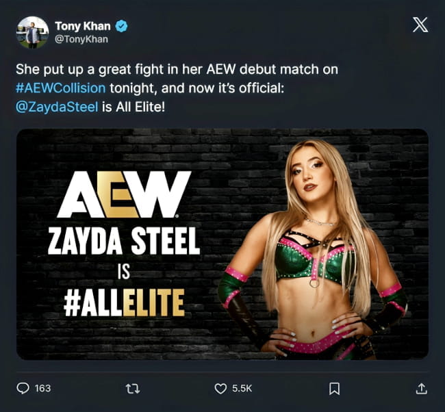 All Elite Wrestling has further bolstered its roster with the signing of Zayda Steel, a promising talent previously part of WWE’s Independent Development Program. Tony Khan made the official announcement on X on January 18, 2026, following Steel’s AEW in-ring debut against Marina Shafir on Collision. Steel had previously wrestled for sister promotion ROH last month, and there had been rumors that a contract had been offered.