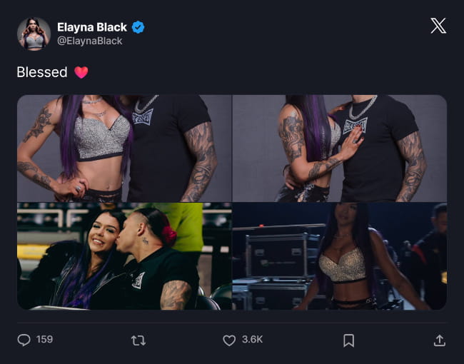 Elayna Black, formerly known as Cora Jade in WWE, has confirmed on X that she is in a relationship with fellow wrestler KC Navarro following her recent TNA debut. Black revealed this on social media by sharing multiple photos of the pair together, simply captioned “Blessed.” Black has unfortunately not had the best of luck finding love in the business, having previously dated Storm Grayson, Blake Christian, Bron Breakker, and Harlem Lewis, so fans are hoping her fortune has now changed.
