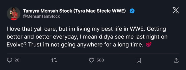 Earlier this week, Tyra Mae Steele, real name Tamyra Mensah-Stock, the Olympic gold medalist-turned-WWE superstar, tweeted about winning $350,000 at an amateur wrestling event and being fired by WWE. This prompted multiple wrestling websites to report her departure, and fans rallied in her support, sharing words of encouragement. However, she was actually talking about a dream she had, which got miscommunicated due to a poor choice of words. And now she has clarified her employment status, tweeting, “Trust me, I’m not going anywhere for a long time.”