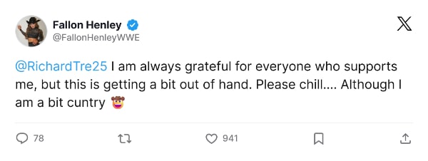 Social media is a great way for fans to interact with celebrities whom they would never typically get to communicate with. However, some go way overboard, and now, in a perfect example of this, one fan of NXT’s Fallon Henley has caught the attention of X users after ranting that she didn’t like his tweets, going so far as to call her an “ungrateful c*nt.” Yet while many wrestlers would be distressed to receive such vitriol online, it appears Henley was unfazed, as she asked the fan to “chill” and acknowledged his insult, jokingly saying, “I am a bit c*ntry.“