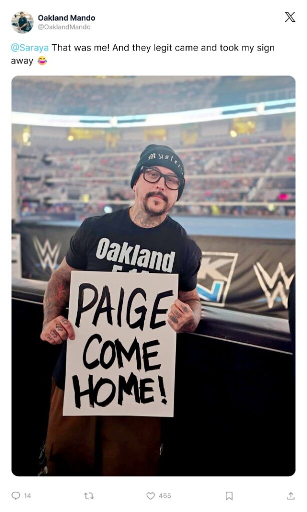 During this week’s episode of SmackDown, Saraya would take to social media to acknowledge a fan in attendance who was holding a sign saying “Paige Come Home.” However, it appears that having brought it to everyone’s attention, WWE confiscated the sign, as the fan responsible has since disclosed on X that security took it off him. Why WWE wouldn’t want the sign on television is unclear, although it has previously been reported that the company has no interest in rehiring the former AEW star.