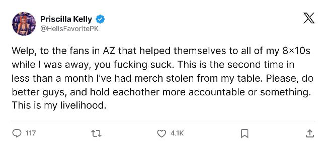 Following her departure from WWE, Priscilla Kelly, previously known as Gigi Dolin in NXT, is back to wrestling on the independent circuit and appearing at conventions, hustling to make a living. However, in both shocking and disappointing news, the former reality television star has taken to X to blast fans who stole all her 8×10 photographs during a meet-and-greet for the Arizona Wrestling Federation.