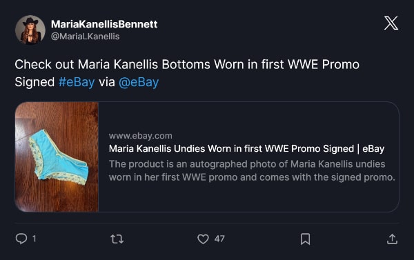 And now, seemingly aware that big money can be made for the right items, Maria Kanellis has begun selling her old outfits on eBay, including a pair of undies she wore during her first WWE photoshoot. However, to make this stand out, the former WWE Diva has grabbed fans’ attention by listing the panties as “a piece of wrestling history” in the description, which is certainly an interesting marketing tactic.