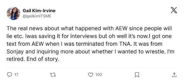 One of the main accusations being leveled at Kim is that she is angry that AEW hasn’t hired her following her shock TNA firing earlier this year. However, the former WWE Women’s Champion has now revealed on X that Sonjay Dutt, who serves as Vice President of Production and Creative Coordination for the company, actually reached out to her by text about wrestling for AEW, but she wasn’t interested due to being retired from the ring.