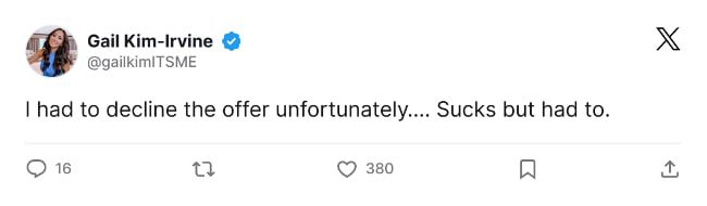 Wrestling icon Gail Kim, a trailblazer in women’s divisions across WWE and TNA, has confirmed on X that she received an offer to return to WWE following her TNA firing earlier this year. This was disclosed while Kim was responding to a fan’s question, saying, “I had to decline the offer, unfortunately.” As of writing, details of the proposed job remain unknown, but it was likely related to working at the WWE Performance Center.