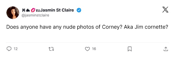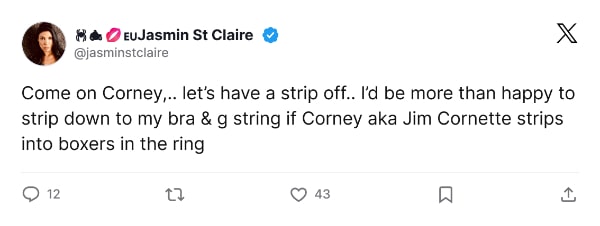Former adult film star Jasmin St. Claire is currently targeting Jim Cornette on X, after he recently criticized JCW, where she currently works as a valet. This would first see her request photos of the controversial booker-turned-podcaster in his birthday suit, and then challenge him to a “strip off,” proposing she’d undress to her bra if he would strip to his boxer shorts. As of writing, Cornette has not responded to this trolling, although the thought of seeing the 64-year-old in his undies has left many on social media troubled.