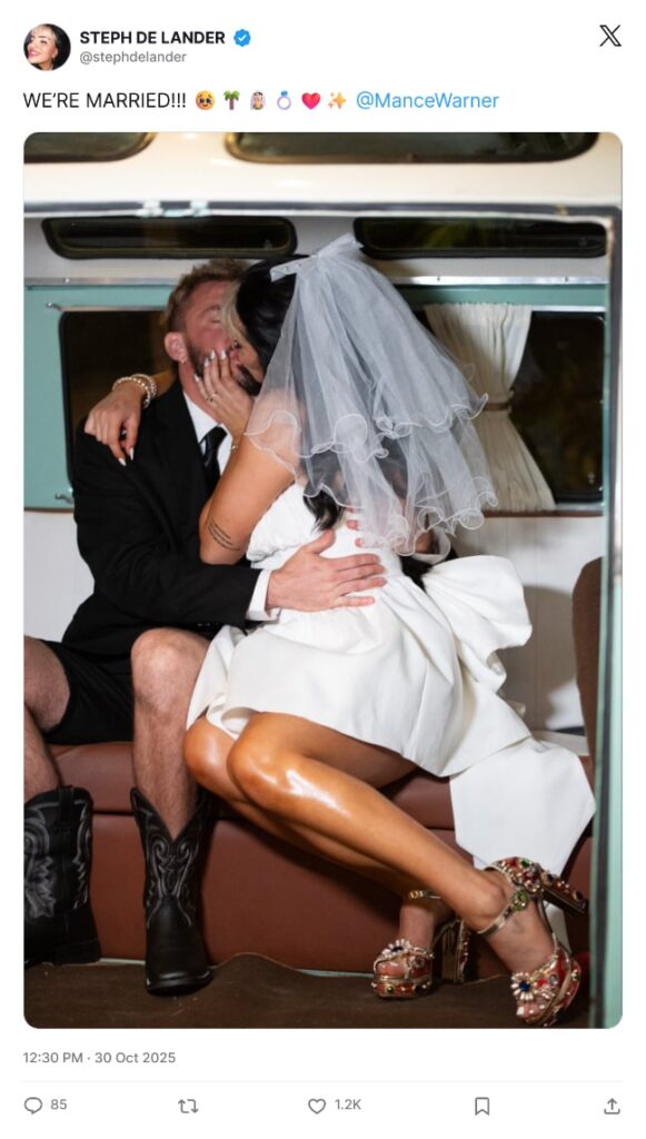 Hailing from different corners of the world, Mance Warner from the U.S. Midwest and Steph De Lander from Melbourne, Australia, found each other through their work on the indie scene, even wrestling each other in the past. And now, having announced their engagement earlier this year, the loved-up couple have officially tied the knot, following a private ceremony on Wednesday. The bride confirmed this herself on Thursday by tweeting a photo of her passionately kissing her husband, captioned “WE’RE MARRIED!!!”