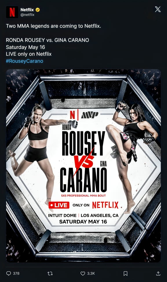 In a groundbreaking announcement, Netflix, the home of Raw in the United States, has confirmed its first-ever live MMA event, headlined by the long-awaited dream matchup between pioneers Ronda Rousey and Gina Carano. The clash is set for May 16, 2026, at Los Angeles’ Intuit Dome, featuring five five-minute rounds and is being promoted by Jake Paul’s Most Valuable Promotions. Both fighters are coming out of retirement, with Rousey (12-2) stepping away from MMA in 2016, while Carano (7-1) did so in 2009.