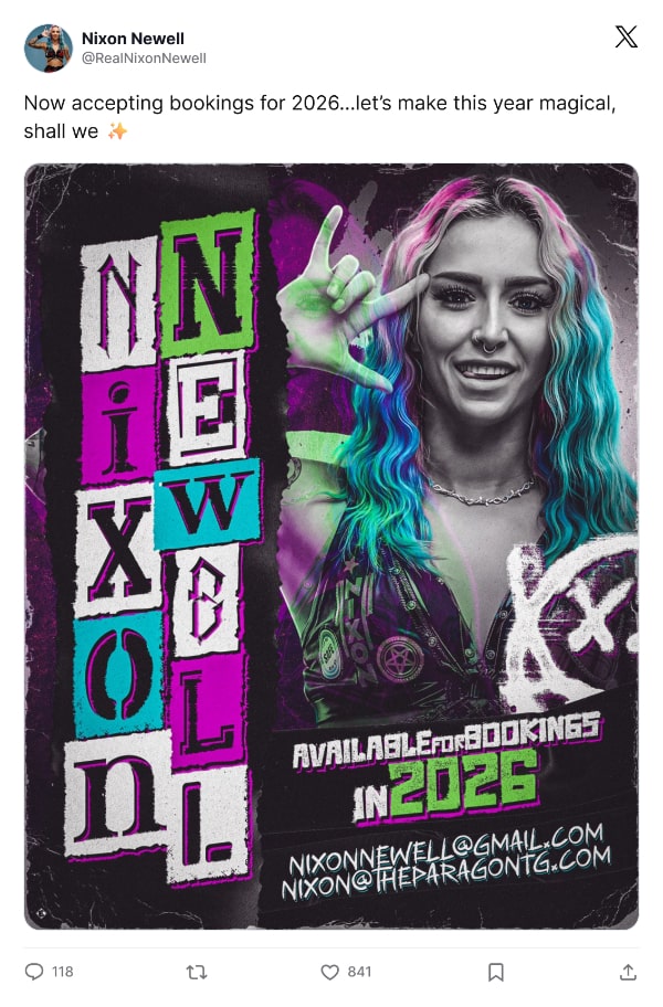 Former WWE star Tegan Nox, now performing as Nixon Newell, recently made headlines after she and her partner, Miranda Alize, objected to losing a three-minute match on Collision. And while her social media activity suggests the Welsh wrestler is now focused on building her OnlyFans career, it’s now known that her future remains in the ring. This is evident as she has now taken to X to inform promoters that she’s accepting bookings, declaring, “Available for bookings in 2026… let’s make this year magical.”