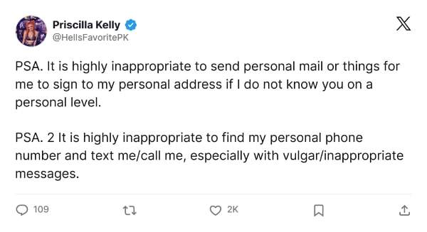 Priscilla Kelly, formerly known as Gigi Dolin in NXT, has posted a public service announcement on social media, condemning those who obtained her private phone number and sent vulgar texts and calls. Kelly also criticized fans mailing items or autograph requests to her home address without any personal connection, emphasizing that such actions are invasive. Whether this reaches the type of fan who does this is unclear, but it should at least open a few eyes to respecting boundaries.