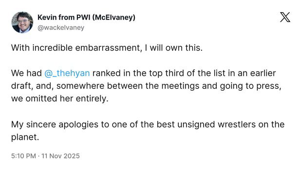 Still, it has since been discovered that her omission was a mistake, as after it was pointed out that she was omitted, PWI editor Kevin Elvaney has apologised on X “to one of the best unsigned wrestlers on the planet.“