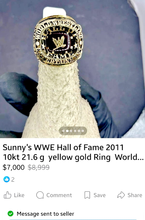 “Sunny’s WWE Hall of Fame ring it’s engraved with her name Gold color with the classic WWE logo on top. Has ‘World Wrestling Entertainment’ and ‘Hall of Fame’ text around the center. Side of ring has ‘2011’ and two wrestlers. Great for any wrestling fan. Size 6.5” – facebook.com/groups/178678715616768