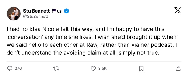 And now, with quotes from her podcast having gone viral, Barrett has taken to X to say he wishes Bella had addressed this with him directly rather than making it public. Additionally, he would dispute the claim that he avoided her on Monday, revealing they did briefly interact at Raw.