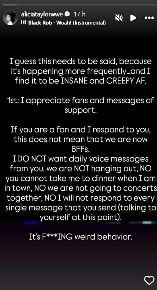 WWE ring announcer Alicia Taylor, who has worked with the company since 2018, has publicly addressed fans via her Instagram Story, calling out increasingly frequent “INSANE and CREEPY AF” behavior, including daily voice messages, invitations to hang out, dinner offers, concert plans, and expectations of constant replies. Taylor emphasized that responding to support messages does not mean friendship, stating, “If you are a fan and I respond to you, this does not mean that we are now BFFs,” urging respect for boundaries.