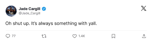 Jade Cargill has sparked controversy on X after tweeting a jab at Jordynne Grace, saying that she left her “glutes at home,” following her SmackDown debut in Berlin. And while this was obviously playful banter between two gym regulars, some fans would later accuse the former AEW star of body-shaming Grace. Still in a typical Cargil fashion, the WWE Women’s Champion isn’t taking any nonsense from fans online and would unapologetically respond by tweeting, “Oh shut up. It’s always something with y’all.”